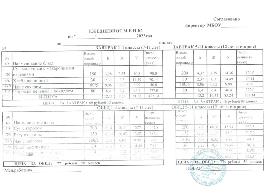 Обучающиеся питаются в школьной столовой, имеющей обеденный зал, технологические цеха, складские помещения, по классам согласно графику, утвержденному директором МБОУ "Нижнегорская СОШ №2" на текущий учебный год. Контроль посещения столовой и учетом количества фактических приемов пищи, полученных обучающимися, возлагается на ответственного за школьное питание, определяемого приказом директора школы в установленном порядке, и заведующего производством (шеф-поваром) школьной столовой.